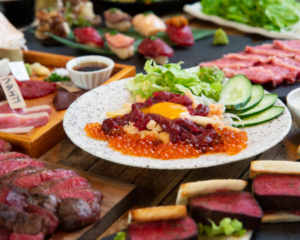 定番の馬刺し盛り合わせやユッケ、馬肉レアステーキも楽しめるコース! (90分飲み放題付)映える #炙り馬 もご用意!定番大人気!